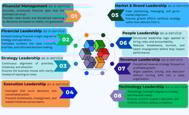 Integrated Strategy, Financial, and Execution Leadership delivered through a structured monthly model. Coordinated leadership designed to create clarity, accountability, and measurable momentum.